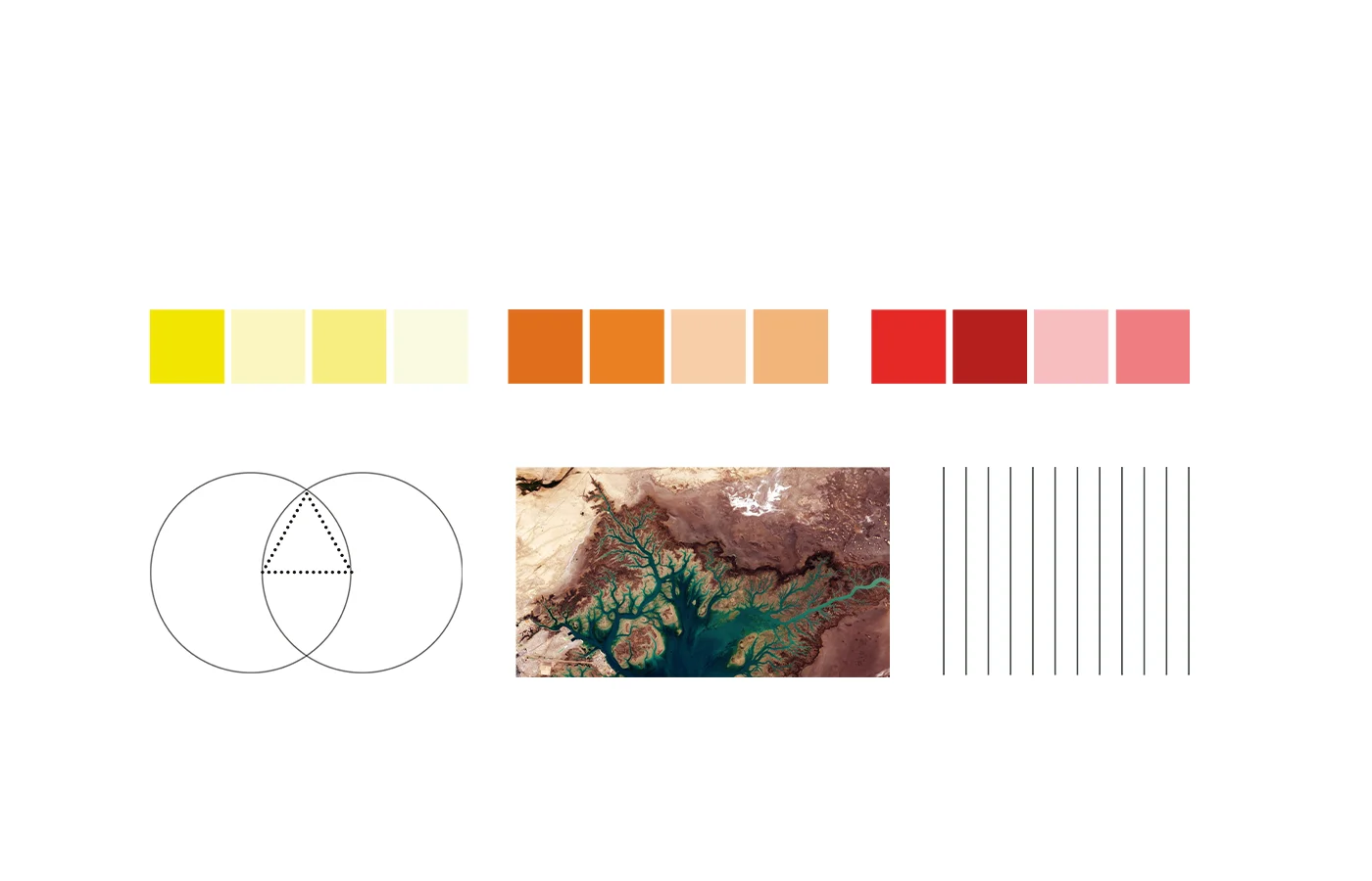 La paleta cromática utiliza colores complementarios y análogos de la rosa cromática. Abarca complementarios en matiz, tono y saturación. La horizontalidad conlleva una precisión total, además sugiere sensación de estabilidad, calma y reposo. Los patrones de apilamiento son formas angulares que generan un diseño de eficiencia, transparencia y estabilidad.